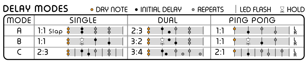 Each of the Delay modes, Single Head, Dual Head and Echo Pong contain three switchable rhythmic variations